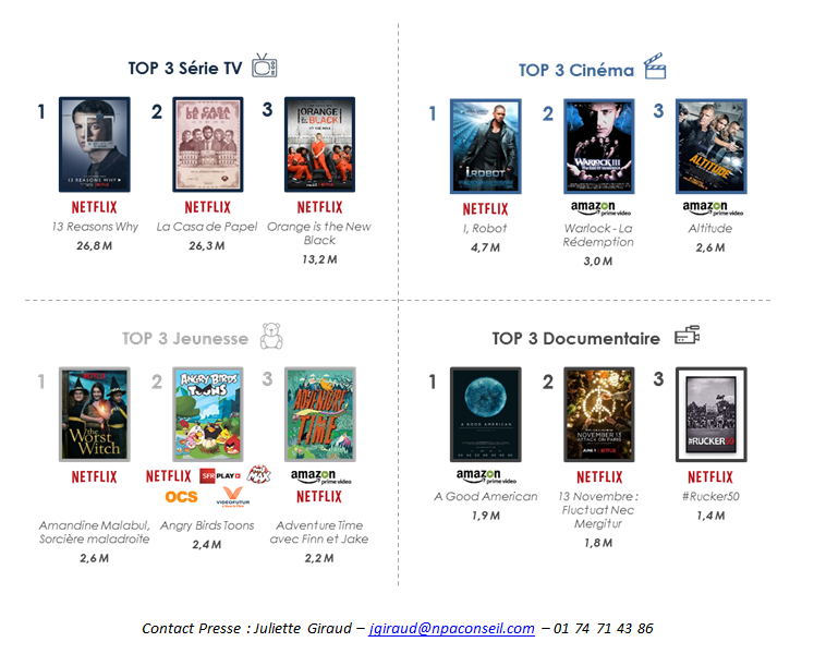 Cette semaine, NPA publie le classement des programmes les plus visionnées en SVOD entre le 1er janvier et le 26 août 2018.
